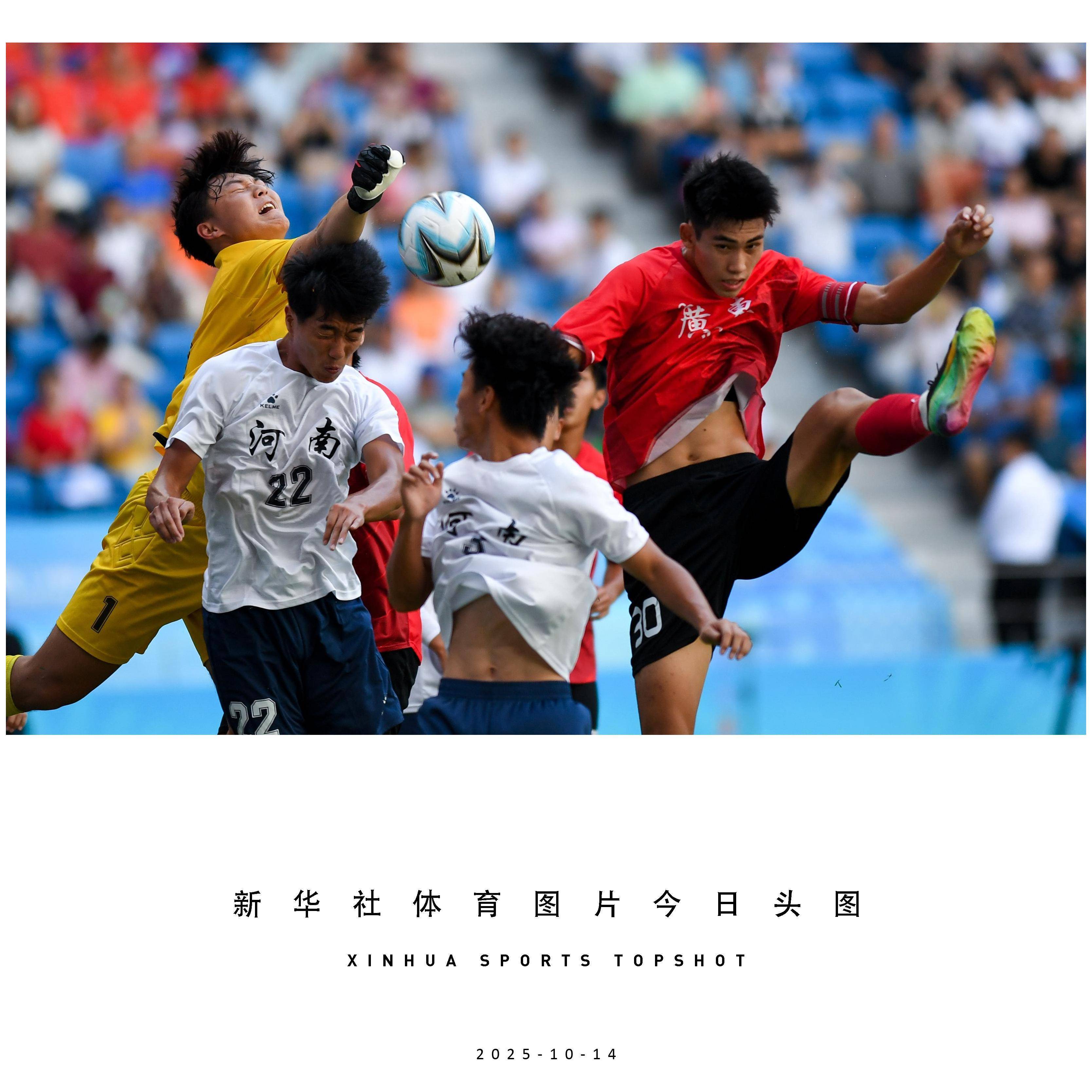 新华社照片,北京,2025年10月14日 10月14日,河南队守门员刘鹭洋(左一)在比赛中扑救。 当日,在广东深圳举行的第十五届全国运动会男子足球18岁以下组A组第一场比赛中,广东队4比2战胜河南队。 新华社记者 毛思倩 摄