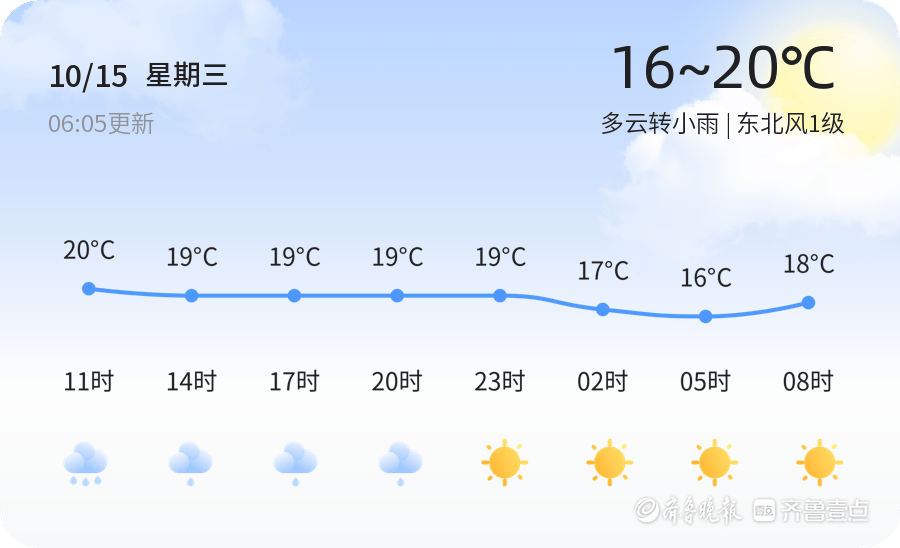 今天是2025年10月15日,星期三,农历八月廿四。日照市今日天气多云转小雨,当前温度18.6℃,东北风1级,空气湿度79%,PM2.5指数为23,空气质量等级为优。今日的天气变化较大,市民出行时建议携带雨具,注意天气变化,及时增添衣物。由于今日气温适中,空气质量良好,适合户外活动。