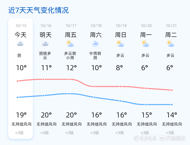 明天10月16日,淄博市天气将由阴转多云,气温稍有上升,预计在11℃至20℃之间,风力与今日相似,仍为无持续风向,风力小于3级。市民可适当减少衣物,但早晚仍需注意保暖。