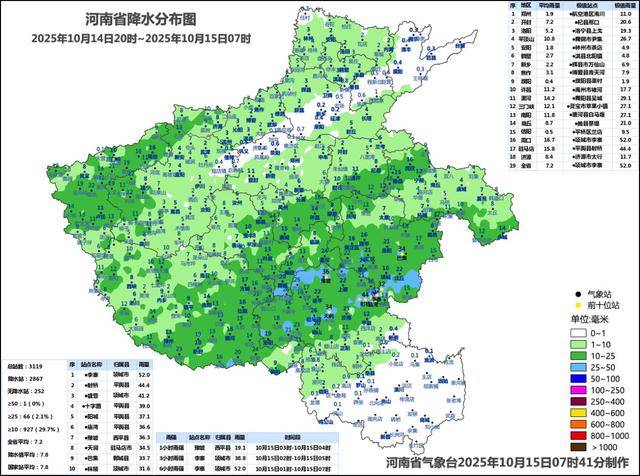 省气象台监测显示,10月14日20时至15日7时,我省淮河以北出现小到中雨,南部局部出现大雨或暴雨。降水量位列前三的分别为:项城市李寨52.0毫米、平舆县射桥44.4毫米、项城市盛营41.2毫米。整点最大小时降水量为西平县豫坡19.1毫米(10月15日3时至4时)。此外,我省西北部、西部、东部局部出现大雾天气,其中郑州、南阳等地部分县(市、区)最低能见度小于等于200米,郑州局地最低能见度小于等于50米。最低能见度前三站分别为:嵩山32m、南召179m、卢氏259m。