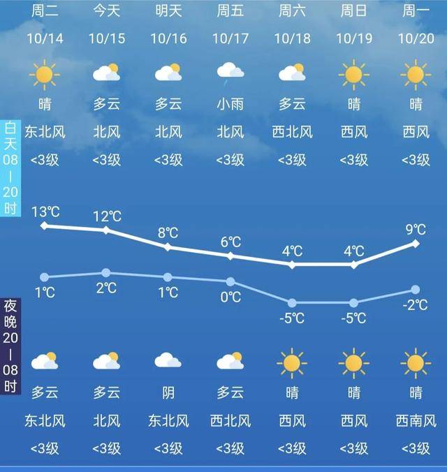 预计未来一周(10月15日-21日),全省平均气温4.0℃左右,比常年6.6℃偏低。西部:3.0℃左右,中部:4.0℃左右,东部:5.0℃左右。