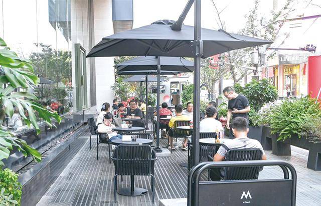 10月14日,金华最高气温28℃,比前一天最高气温下降8℃,市区西市街商圈的商场外坐着不少消费者。10月13日晚上下了一场大雨,一场秋雨一场凉,凉爽天气也带动商业街人气,年轻人、老人、儿童等各类人群聚集,拉动消费。(李建林)