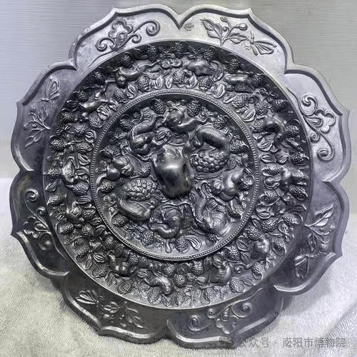 海兽葡萄镜上,西域的狮子与中原的瑞兽共舞,葡萄藤蔓缠绕成丝绸之路的图腾。金银平脱镜的凤凰展翅时,金箔会随光线流转,如同《长恨歌》里“云鬓花颜金步摇”的惊鸿一瞥。这些铜镜背面,盛开着整个盛唐的想象力。