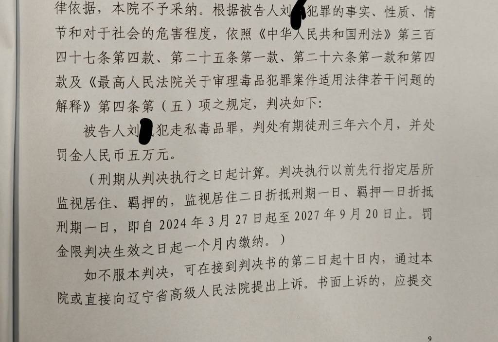 10月14日,刘某被控走私毒品案一审公开宣判,沈阳中院判决被告人刘某犯走私毒品罪,判处有期徒刑三年六个月,并处罚金人民币五万元。