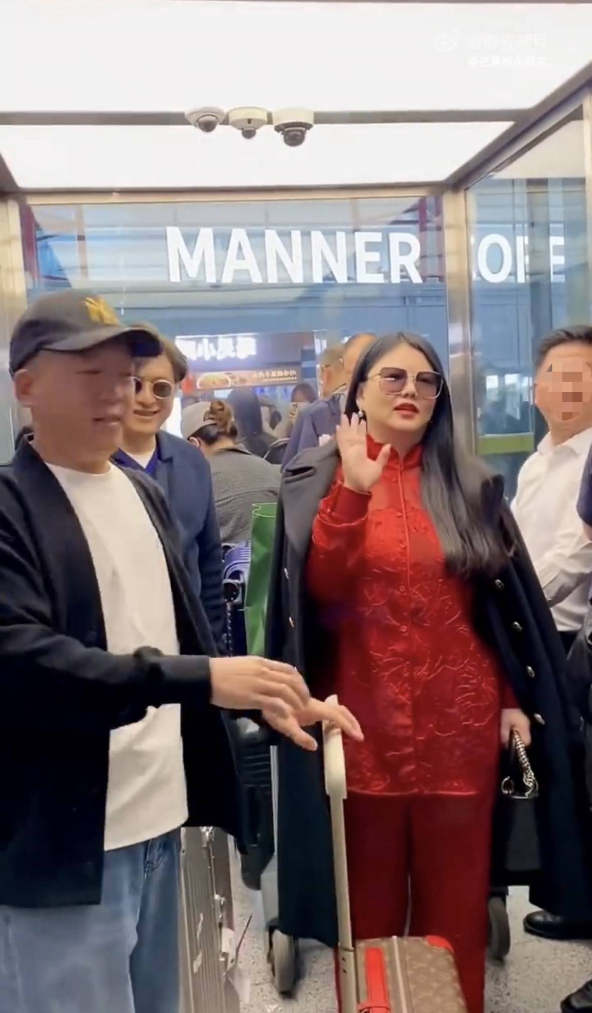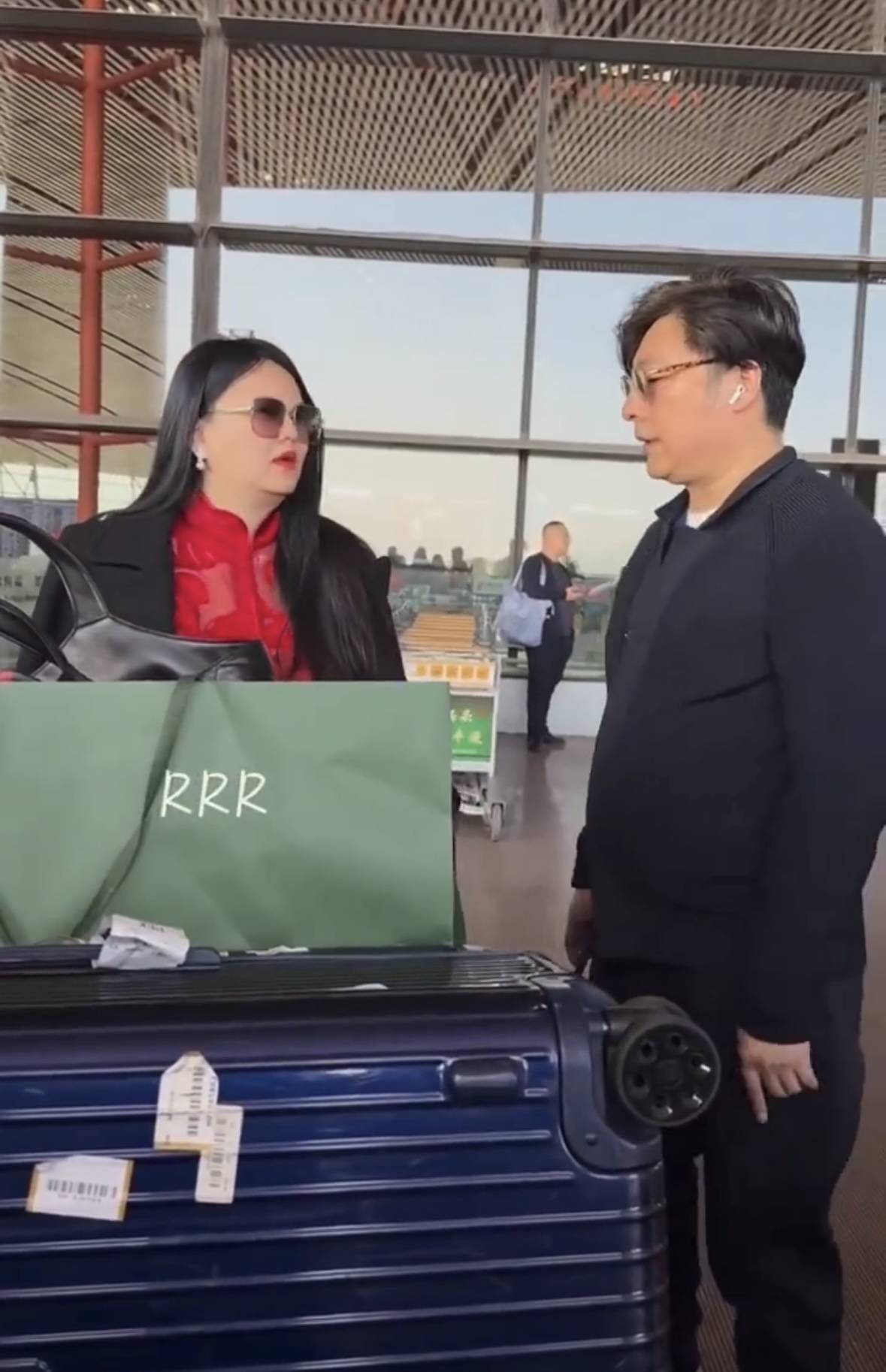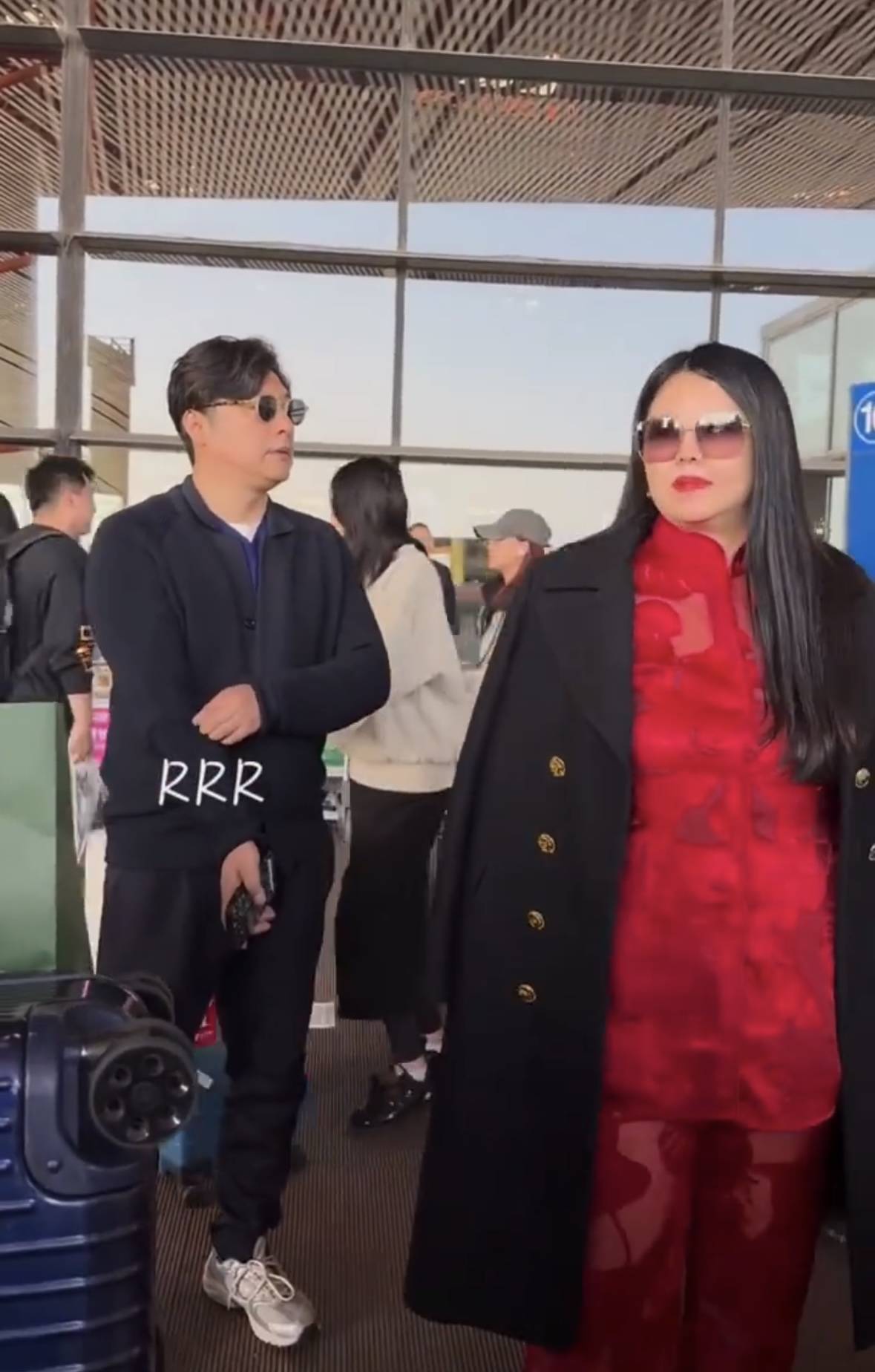 搜狐娱乐讯 10月14日,李湘和王岳伦回国的视频流出。图中,李湘穿大红色套装披着黑色大衣,王岳伦打扮休闲。