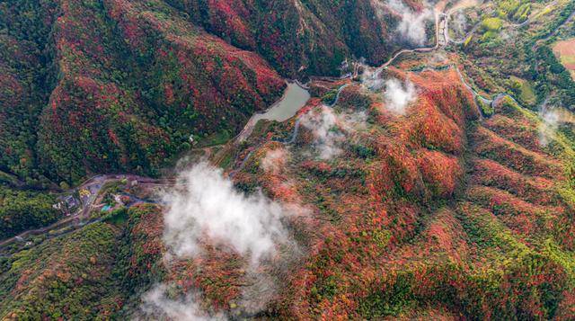 王维诗里的云台山如今正褪去绿意,换上红衣。登临茱萸峰,看群山连绵在云雾中若隐若现;漫步红石峡,丹霞地貌与碧水清潭在红叶点缀下相映成趣。从十月的色彩斑斓,到十一月的红如火焰,这里的秋色持续在线,就等你来打卡。