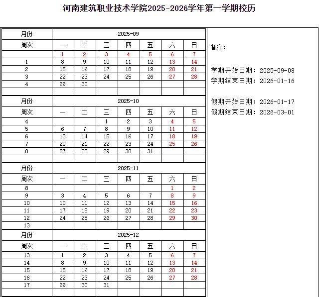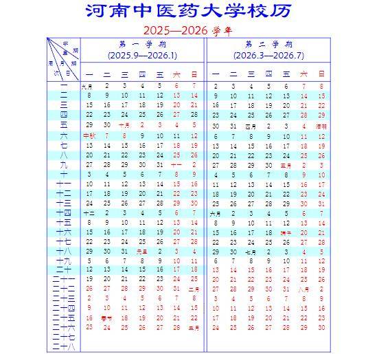 第一学期:2025年9月6日—2026年1月25日(20周)