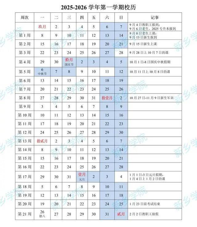第一学期:2025年9月4日-2026年1月25日(21周)