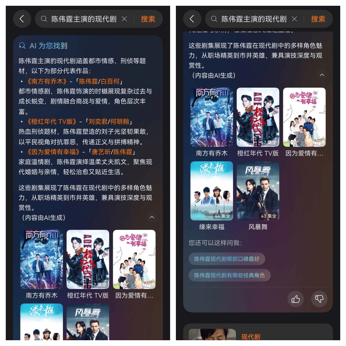 要是以前,我肯定得跳出去打开浏览器慢慢搜,但现在我可以直接用AI搜功能,只需要在华为视频的搜索框输入“想看陈伟霆主演的现代剧”,AI就能给出详细的列表。据说,这个功能还能通过一句模糊的台词、一段剧情描述就精准找到对应的影片,再也不怕想不起影视剧名字的尴尬了。