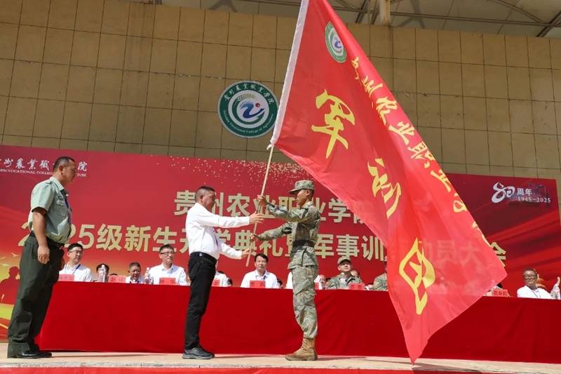 大会现场,鲜艳的五星红旗飘扬在农职院上空,雄浑有力的国歌拉开大会序幕。贵州农业职业学院党委书记邓庆生宣布军训开始。