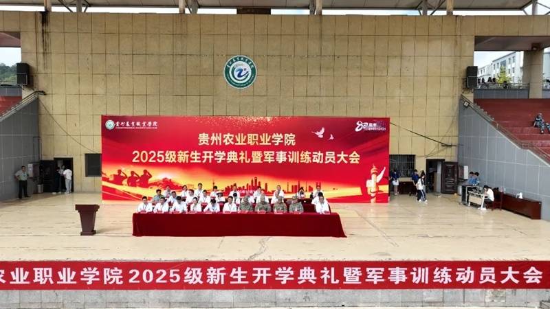 10月11日,贵州农业职业学院新生开学典礼暨军训动员大会举行。学院党委书记邓庆生,院长苏跃,党委副书记黄华,党委委员、副院长钟华,党委委员、纪委书记赵祥,党委委员、组织人事部部长肖连军,学院相关职能部门负责人、军训教官、教师代表、2025级新生辅导员及班主任、2025级全体新生5100余人参加此次开学典礼。大会由党委副书记黄华主持。