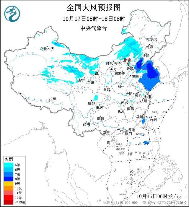 中央气象台10月16日06时继续发布大风蓝色预警:预计,10月16日08时至17日08时,新疆东部、西藏北部、青海北部和西部、甘肃西北部和东南部、宁夏、内蒙古中西部、陕西中北部、山西中北部、河北西北部、辽宁南部、山东北部等地的部分地区有5~6级、阵风7~9级的大风;渤海、黄海东南部、南海东北部的部分海域将有7~8级、阵风9级的大风。