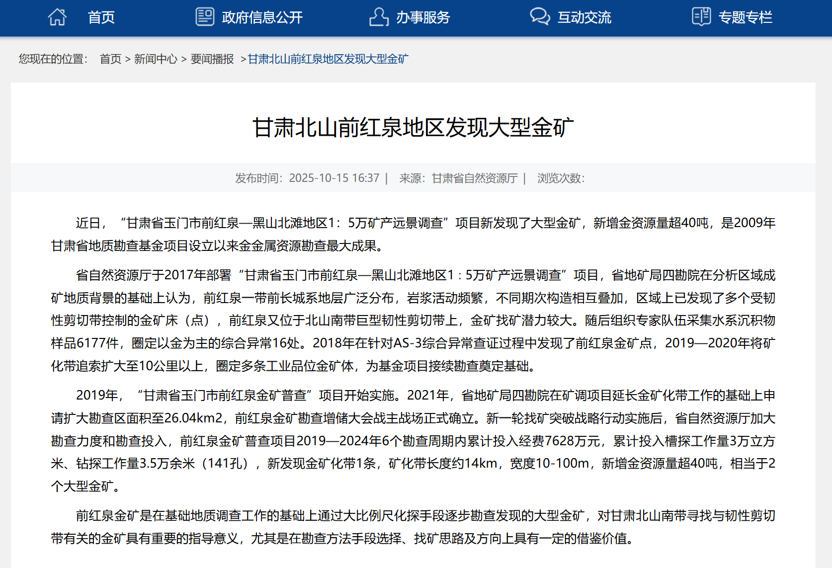 甘肃省自然资源厅网站10月15日消息,近日,“甘肃省玉门市前红泉—黑山北滩地区1:5万矿产远景调查”项目新发现了大型金矿,新增金资源量超40吨,是2009年甘肃省地质勘查基金项目设立以来金金属资源勘查最大成果。