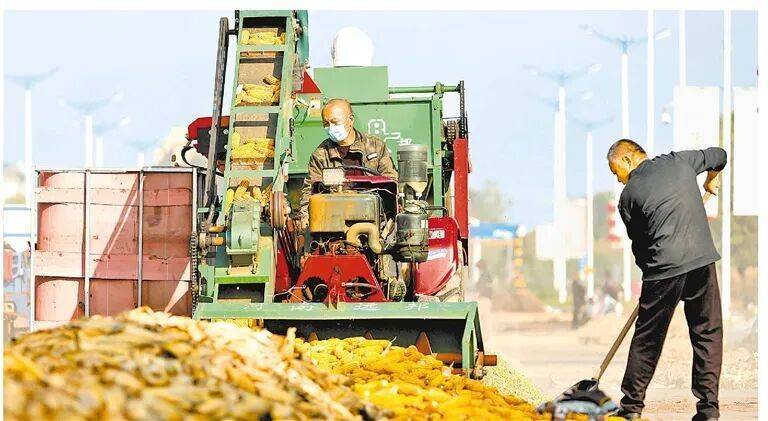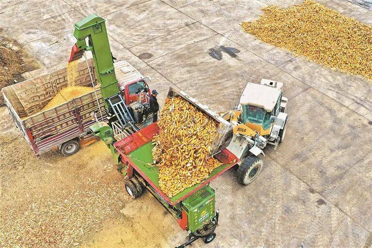 10月11日,在辉县市祥豫农业专业合作社,社员操作农机,将收获的玉米进行脱粒,为后续烘干等环节做准备。 赵云 摄