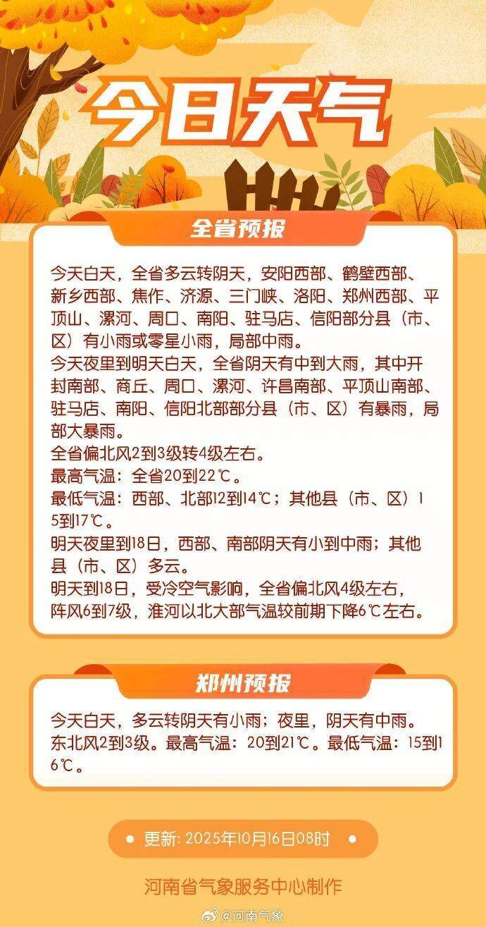 据河南气象消息,16日夜间至17日,河南再迎暴雨,16日夜里到17日白天,全省阴有中到大雨,其中开封南部、商丘、周口、漯河、许昌南部、平顶山南部、驻马店、南阳、信阳北部部分县(市、区)有暴雨,局部大暴雨。