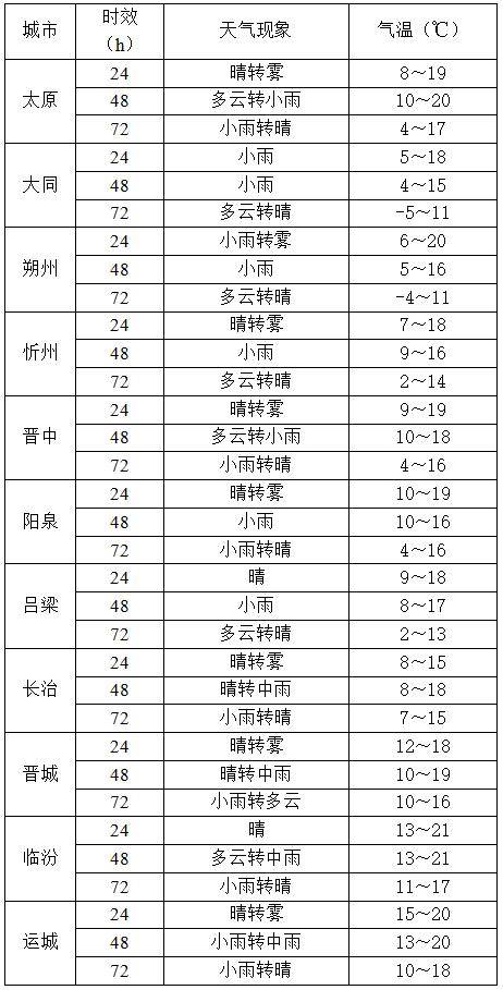 全省多云转阴天,有阵雨或小雨,中部局部和南部大部分地区有中雨,吕梁、临汾、运城等地的局部地区有大雨;降水间歇北部局部和中南部部分地区有雾或轻雾。
