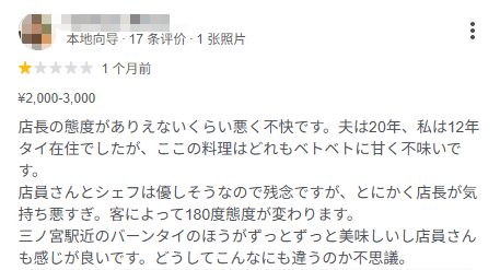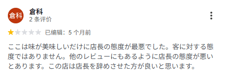 事后,博主去谷歌地图上一搜,发现这家店的差评堪比长江水,滔滔不绝。大家的吐槽集中在同一个点:店长态度恶劣、区别对待、甚至有歧视。