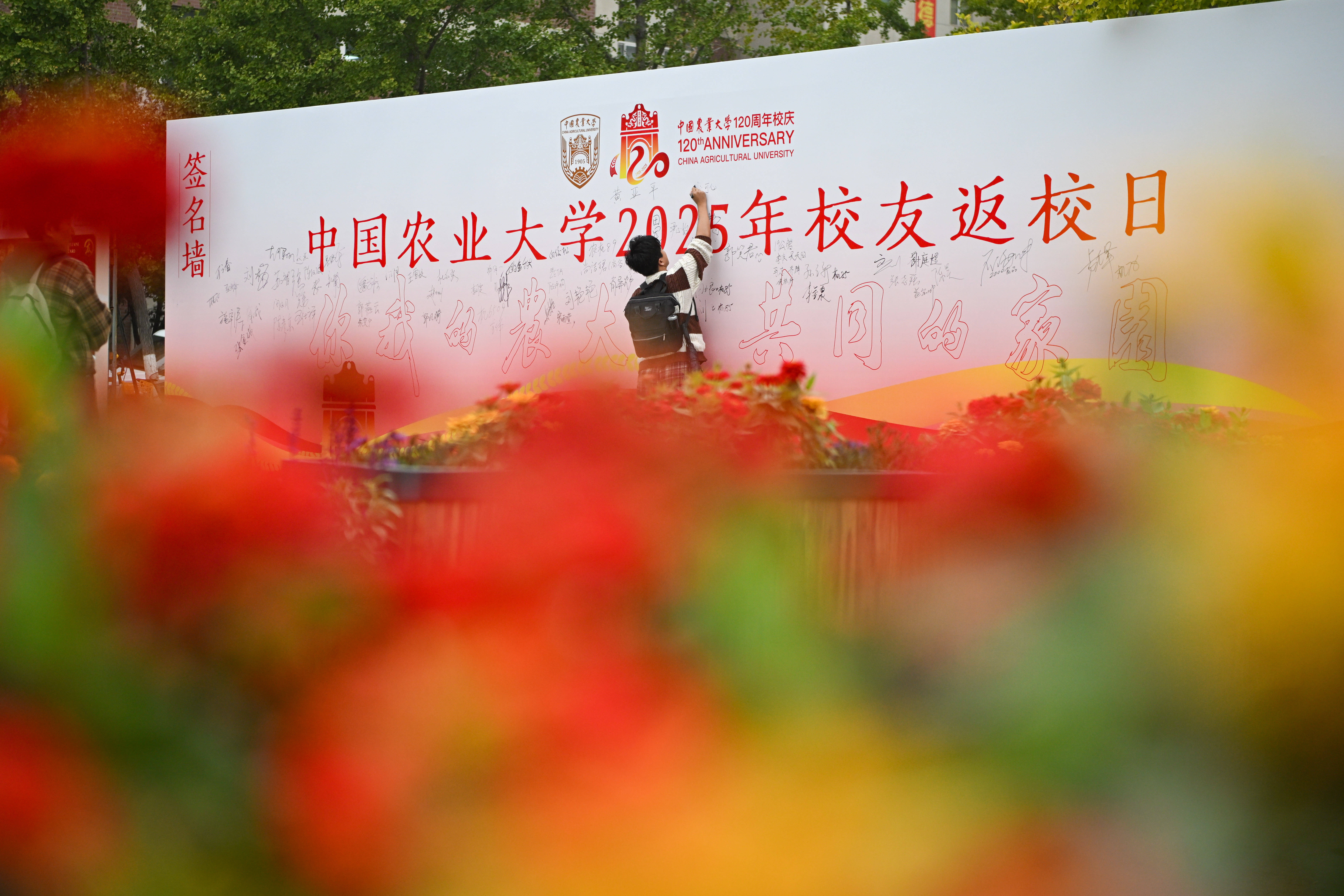 这是10月16日在中国农业大学东校区拍摄的校友返校日签名墙。 新华社记者 陈钟昊 摄