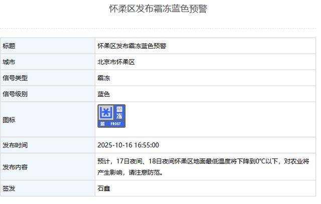 怀柔区发布霜冻蓝色预警,对农业将产生影响