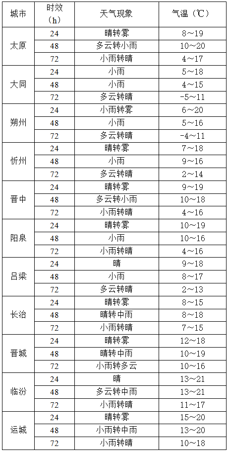 全省多云转阴天,有阵雨或小雨,中部局部和南部大部分地区有中雨,吕梁、临汾、运城等地的局部地区有大雨;降水间歇北部局部和中南部部分地区有雾或轻雾。