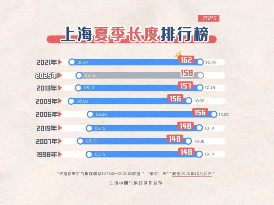 这个夏天,真的太长了。从5月12日入夏至今,上海的夏天已持续整整158天——这是徐家汇气象站有记录以来第二长的夏季。在此期间54个高温日,创下1873年以来历史第二多的纪录;就连10月6日中秋佳节,气温也冲上35.0℃,刷新了上海最晚高温日的历史极值。