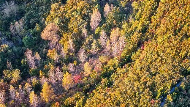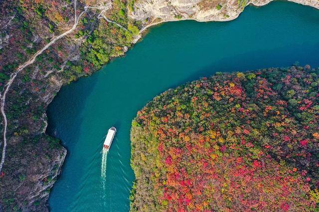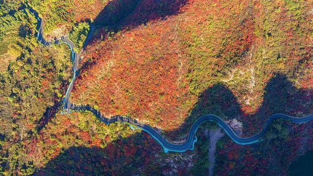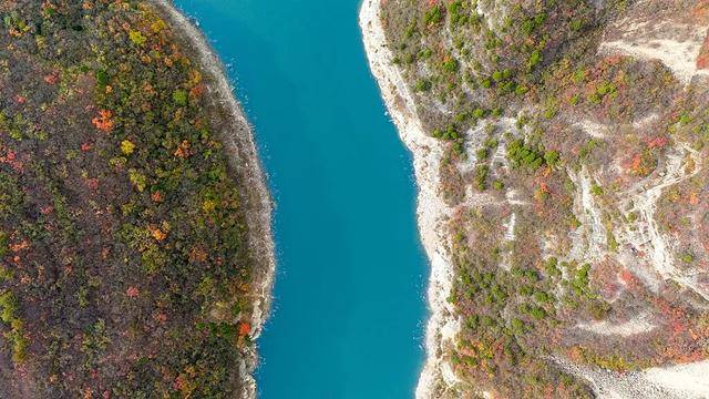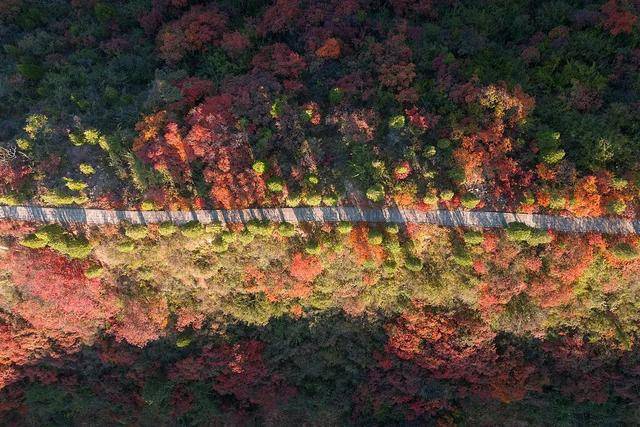 航拍镜头下的重渡沟美得壮观,山峦之间由绿变黄、由黄变红地热闹起来,除了红色和金色、绿色也是主色调,一场色彩享受之旅即将拉开帷幕。
