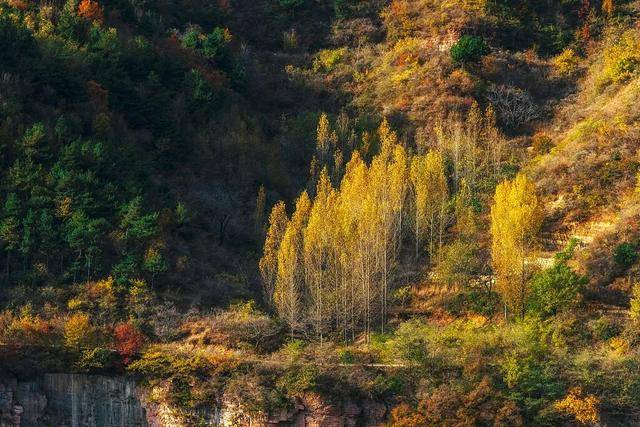 入秋后,山上的红叶都已开始蔓延,草木越发葱茏,色彩多样,衬托着山的层次更具有立体感。红叶映红岩,显出太行山在这一段独有的壮丽景象。