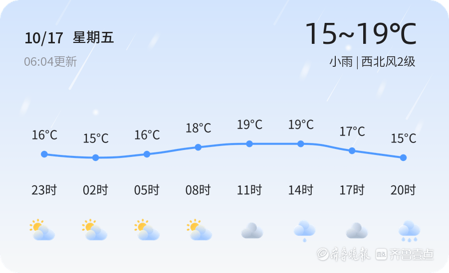 今天是10月17日,农历八月廿六,威海迎来小雨天气。当前温度15℃,预计今日最高气温19℃,最低气温15℃,西北风2级,空气湿度86%,PM2.5浓度为53,空气质量状况为良好。市民出行请注意携带雨具,雨天路滑,驾车请减速慢行,确保行车安全。
