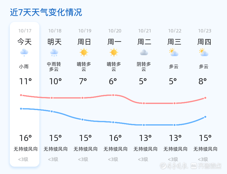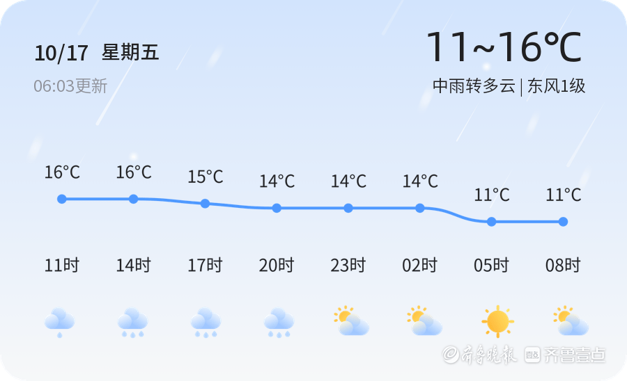 今天是10月17日,星期五,农历八月廿六。泰安市迎来中雨转多云天气,温度在11℃至16℃之间。各区普遍有小雨,气温适中,湿度较高,空气质量良好。