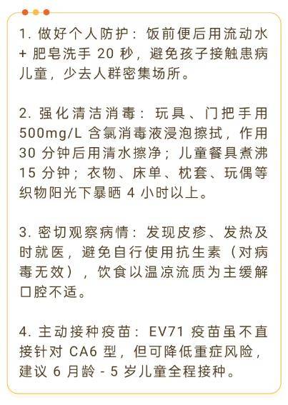 专家表示,手足口病秋季高发,主要是因为气温适宜病毒存活,加之托幼机构人员密集,病毒可通过粪 - 口、呼吸道飞沫及接触传播快速扩散。数据显示,3 岁以下儿童发病率最高,占病例总数的 60% 以上。CA6 型作为今年秋季更替后的优势毒株,人群普遍易感,更易引发聚集性疫情。