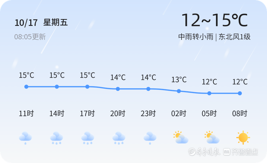今天是10月17日,农历八月廿六,星期五。济宁市迎来持续性降雨天气,今天上午8时05分,全市气温为15.7℃,伴有中雨转小雨,东北风1级。空气湿度为95%,PM2.5指数为52,属于良好水平。今天全市各区均出现不同程度的降雨,市民出行需注意携带雨具,防范道路湿滑。