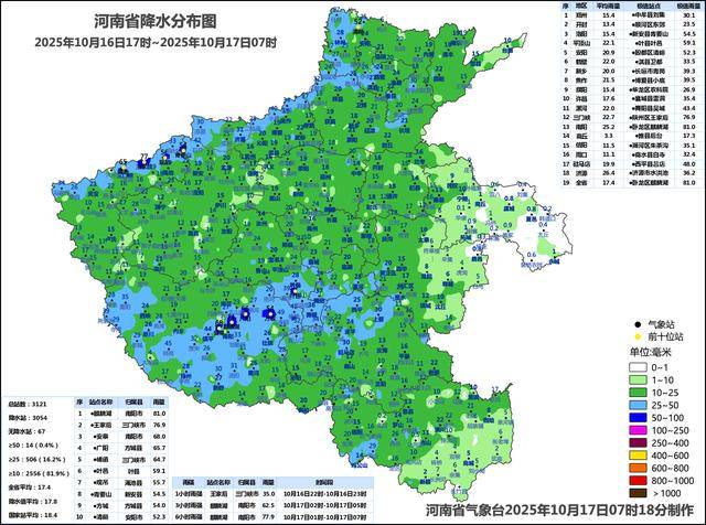 省气象台监测显示,10月16日17时至17日7时,河南省大部出现小到中雨,南阳、驻马店北部、平顶山南部、三门峡北部、济源、焦作北部、安阳西部等地部分县(市、区)出现大雨,三门峡、南阳、平顶山等地局部暴雨。降水量位列前三的分别为:南阳市麒麟湖81.0毫米、三门峡市王家后76.9毫米、南阳市安皋68.0毫米。整点最大小时降水量为三门峡市王家后35毫米(10月16日22时至23时)。