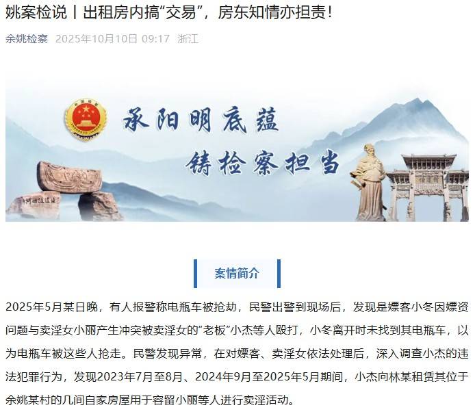 近日,浙江余姚检察院发布一起案例:2025年5月某日晚,有人报警称电瓶车被抢劫,民警出警到现场后,发现是嫖客小冬因嫖资问题与卖淫女小丽产生冲突被卖淫女的“老板”小杰等人殴打,小冬离开时未找到其电瓶车,以为电瓶车被这些人抢走。