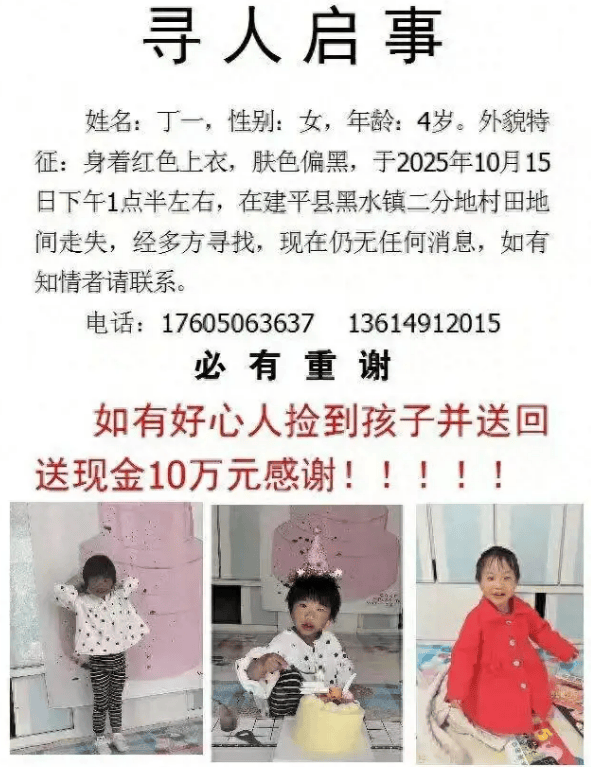 10月15日,辽宁朝阳市建平县黑水镇,一名4岁女童丁一失踪。