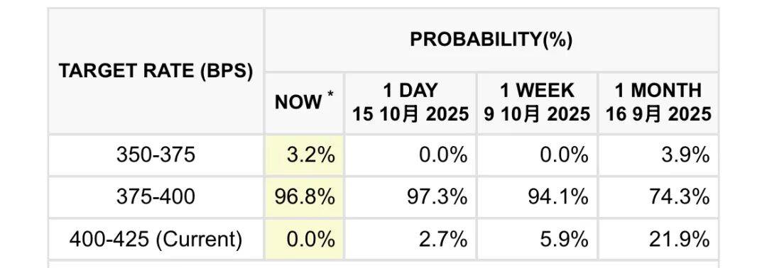 据CME美联储观察最新显示,美联储10月降息25个基点的概率为96.8%,降息50个基点概率为3.2%。前一天10月降息25个基点的概率为97.3%,降息50个基点概率为0%。
