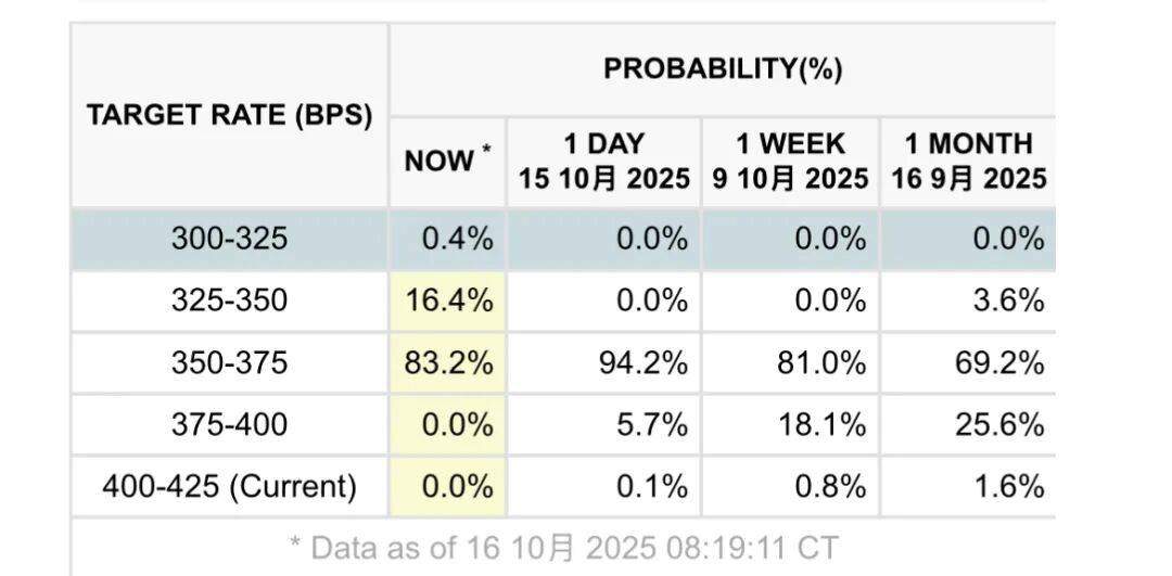 据CME美联储观察最新显示,美联储12月累计降息25个基点的概率为0%,累计降息50个基点的概率为83.2%,累计降息75个基点的概率为16.4%,该数据前一日概率为0%;累计降息100个基点概率为0.4%。