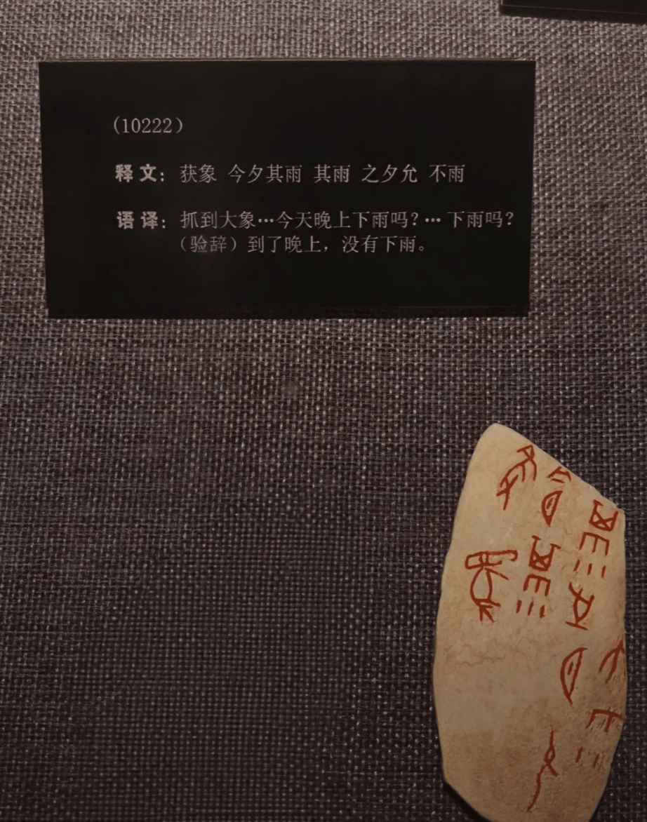 据现场铭牌展示释文,该甲骨记录为:“获象,今夕其雨,其雨,之夕允,不雨。”意思是“抓到大象……今天晚上下雨吗?……下雨吗?(验辞)到了晚上,没有下雨。”如此记载的3000年前古代天气预报,引发网友调侃:“这怕不是祖宗级别的吐槽记录。”一位网友评论称:“堪比古代版‘降水概率99%,却见星星’”。
