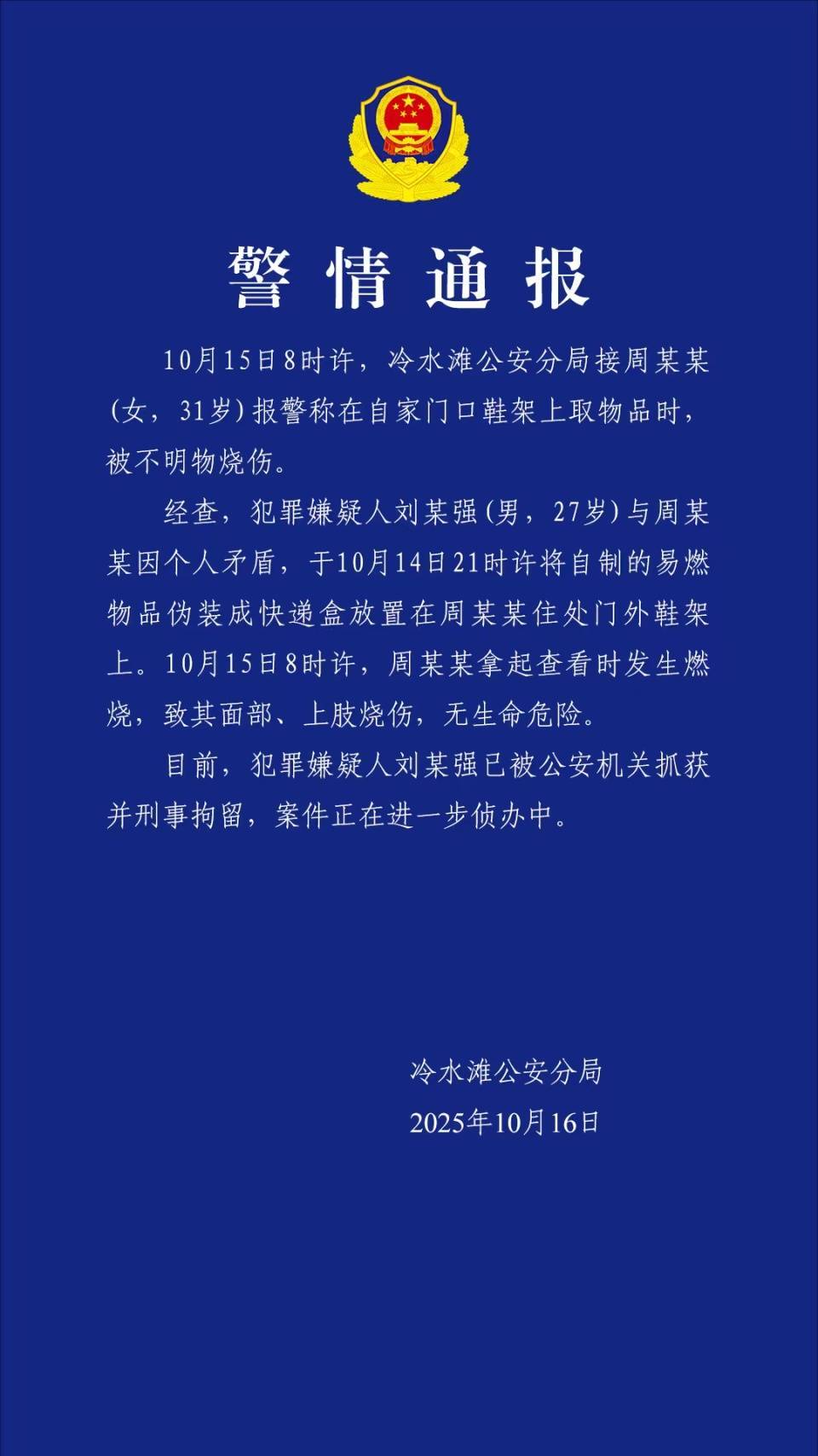 10月16日,湖南冷水滩公安分局发布警情通报:10月15日8时许,冷水滩公安分局接周某某(女,31岁)报警称,在自家门口鞋架上取物品时,被不明物烧伤。经查,犯罪嫌疑人刘某强(男,27岁)与周某某因个人矛盾,于10月14日21时许将自制的易燃物品伪装成快递盒放置在周某某住处门外鞋架上。10月15日8时许,周某某拿起查看时发生燃烧,致其面部、上肢烧伤,无生命危险。