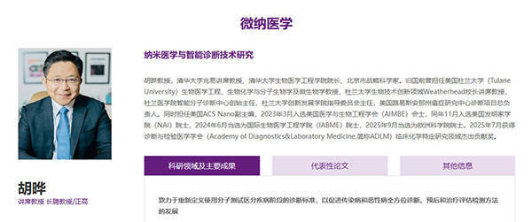据清华大学介绍,归国前,胡晔教授的实验室长期获得美国国防部(DoD)、国家卫生研究院(NIH)、盖茨基金会(Gates Foundation)、世界卫生组织(WHO)等机构稳定资助。目前,他在清华大学的科研项目着力开发针对传染性疾病、神经性疾病及癌症的新型诊断方法。