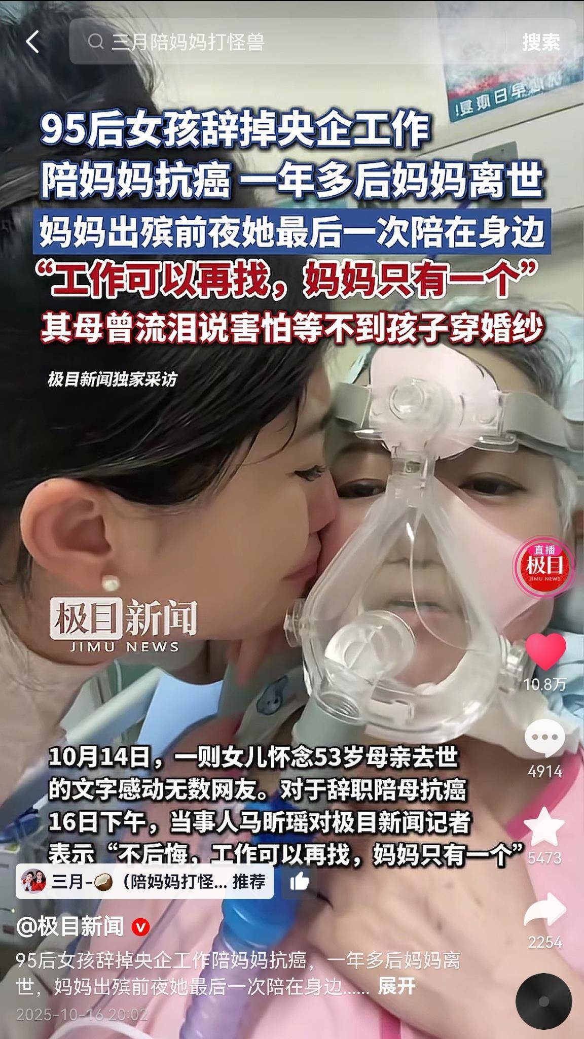 16日,极目新闻记者联系当事人马昕瑶,她当天上午刚送别完妈妈。谈及辞职陪母抗癌,她说:“不后悔,工作可以再找,妈妈只有一个,不留遗憾,很珍惜这段最后时光。”