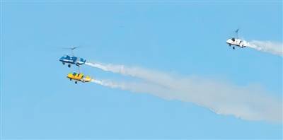 本报讯 (记者 武建玲 通讯员 马菲娅 文/图)10月17日,第七届中国天津国际直升机博览会现场,来自郑州国家通航示范区的3架“河南造”自转旋翼机拉出3条烟带成梯形编队在空中向所有观众致意(如图),一系列高难度飞行动作,展现了河南制造的硬核实力。