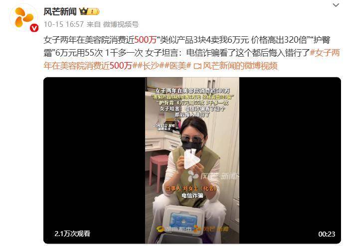 据长沙媒体报道,近日,当地市民刘女士(化姓)自称2年内在一家美容院消费近500万元,包括多巴胺项目120万元、抽脂项目75万元等。在接受采访时,刘女士直呼“(美容院)比电信诈骗还挣钱”。此事引发关注。