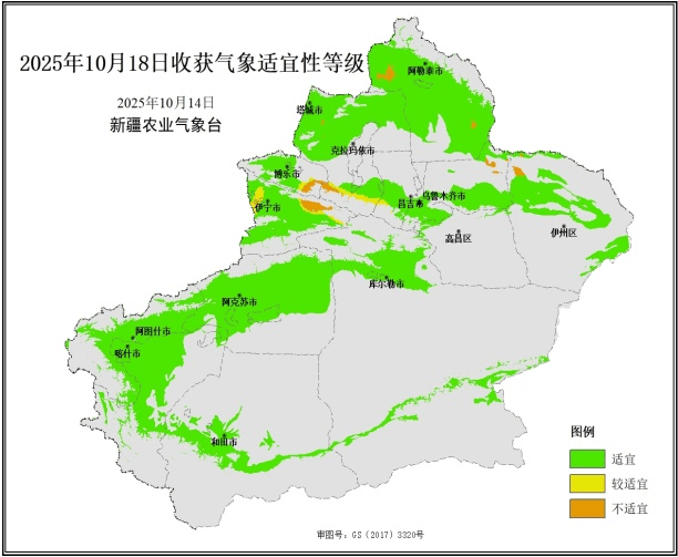10月18日至20日全疆秋收秋种适宜等级预报图 (新疆农业气象台供图)
