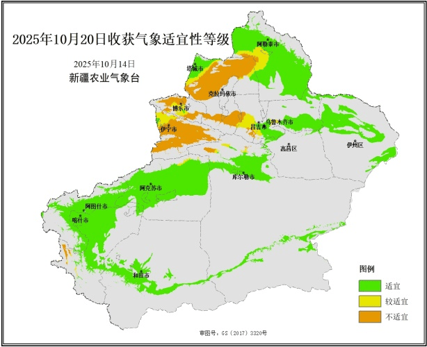 当前,全疆棉区棉花正处于采收期,南疆夏玉米大部分已成熟收获,冬小麦播种也已过八成,部分地区已出苗。根据未来天气预报及作物秋收适宜性气象等级指标,10月19日伊犁河谷不适宜,其余大部适宜;10月20日塔城地区、博州、伊犁河谷不适宜,其余大部适宜。