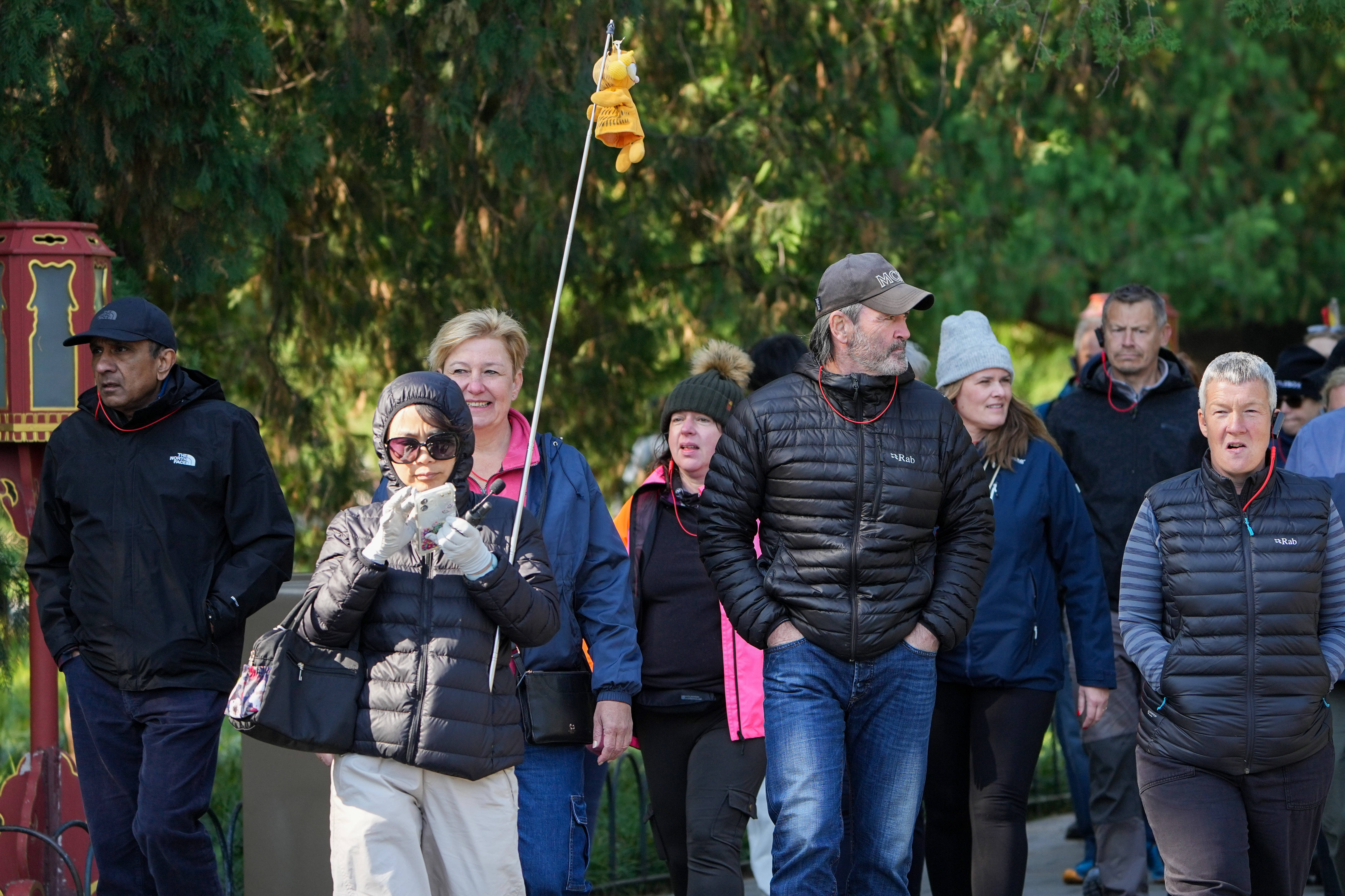 10月18日,在北京天坛公园东门外,几名游客在顶风行走。 新华社记者 鞠焕宗 摄