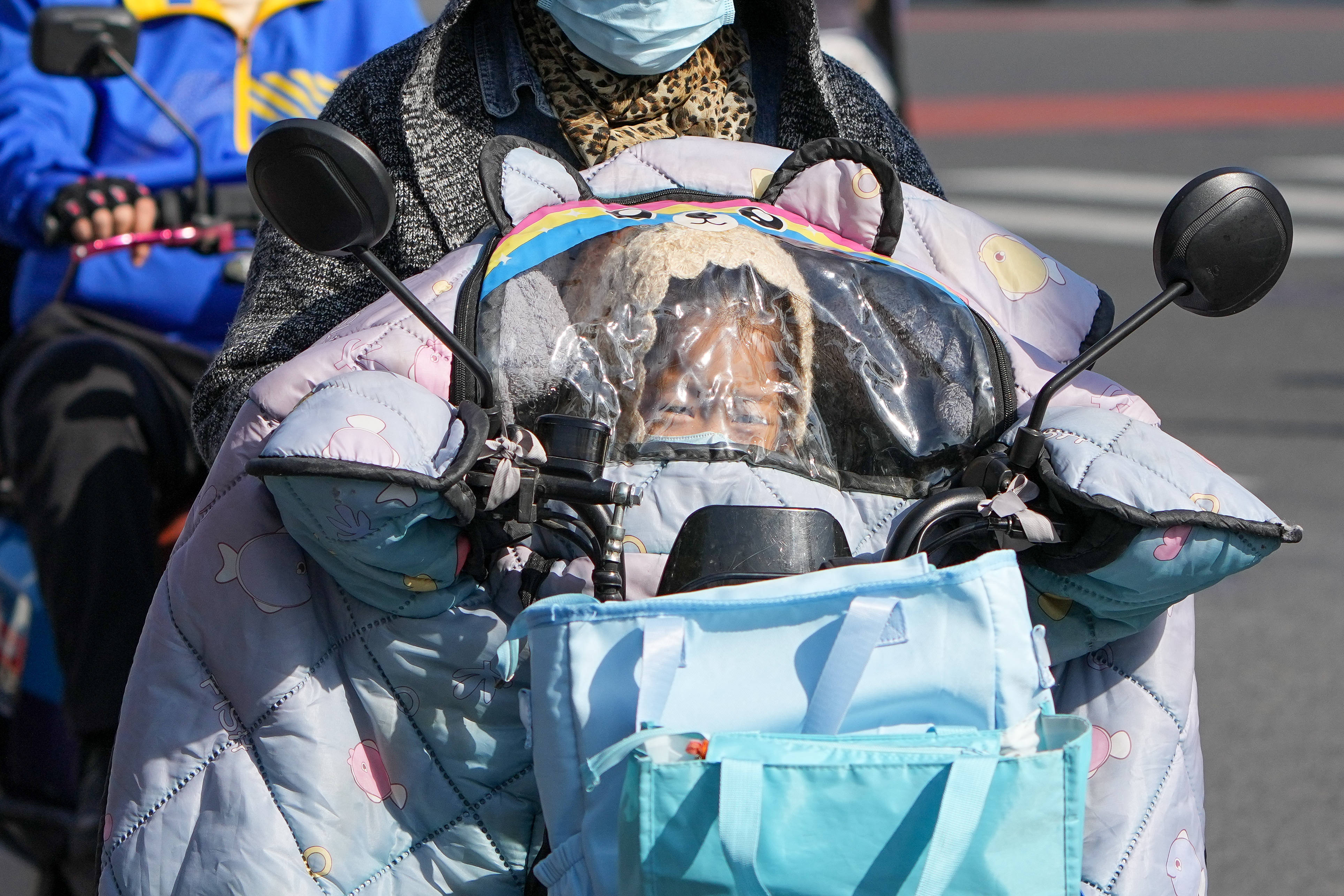 10月18日,一名小朋友在电动自行车的挡风后面躲风。 新华社记者 鞠焕宗 摄