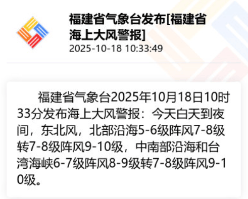 24日,全省沿海、闽中渔场、闽南渔场、台湾浅滩渔场和闽东渔场西部最大风力8—9级,阵风10—11级。