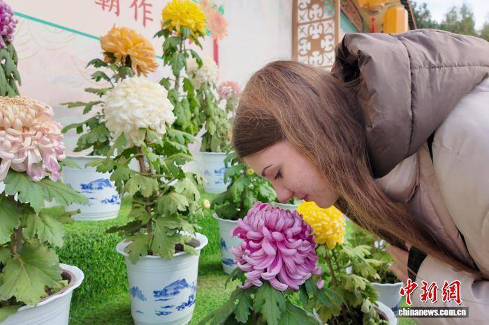 10月18日,河南开封以280万盆菊花扮靓宋韵古城,中国开封第43届菊花文化节于当晚正式启幕。图为俄罗斯游客俯身细闻菊花香气。王士豪 摄