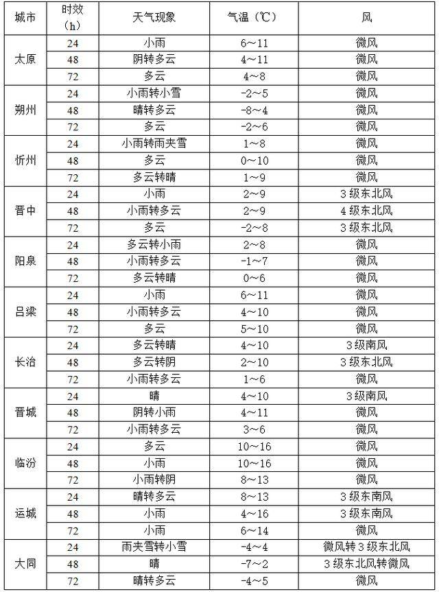 降水:北部从多云转阴天,中南部还是阴天;运城、晋城、忻州西部的部分地方,以及朔州、吕梁、临汾、长治的个别地方会下阵雨或小雨,北部高寒山区会下雨夹雪或小雪。