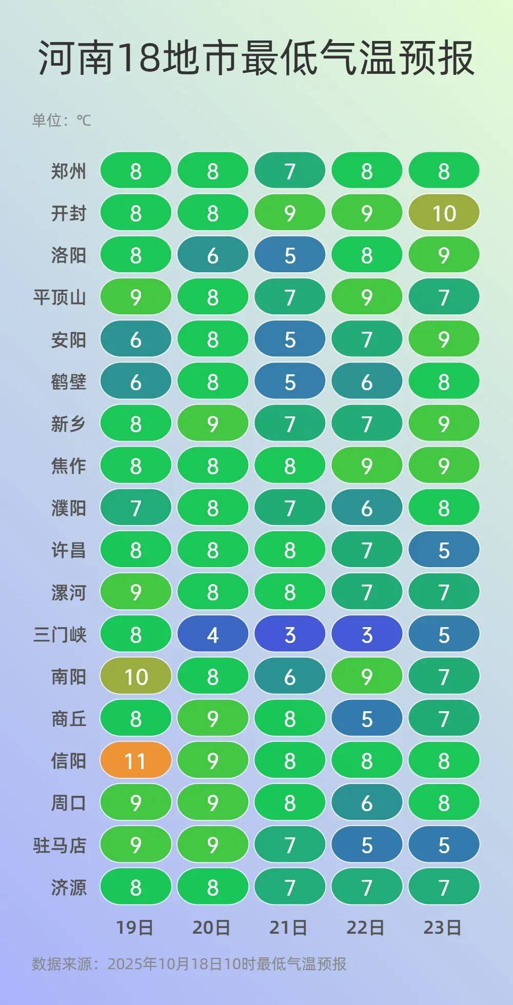 冷空气持续影响,明天到20日,气温较前期下降8℃左右,20日全省大部最高气温仅有10℃出头,西部部分地区甚至不足10℃。最低气温将逐渐跌至谷底,仅有5-7℃,多地将迎今年下半年来最冷早晨。20日凌晨西部山区还将出现初霜冻。
